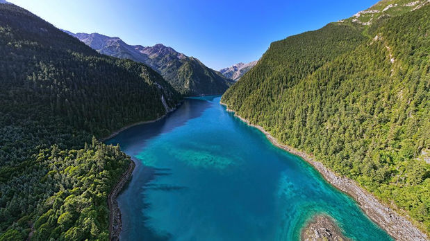 Long Lake: The largest and deepest lake in Jiuzhaigou, backed by snowy mountains.